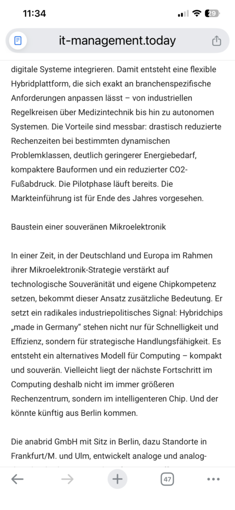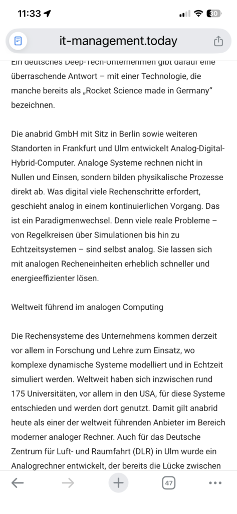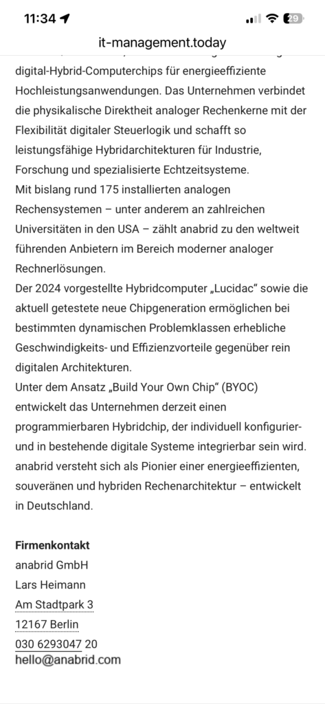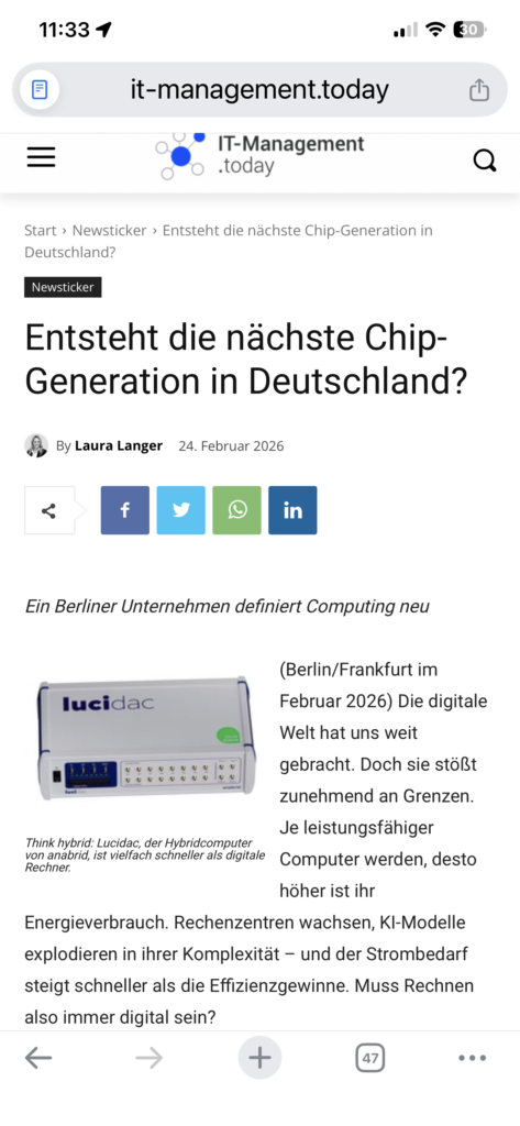 anabrid in den Medien 10. März 2026 / Clemens Adam Inhaltsverzeichnis1 IT-Management.today2 DLR QCI IT-Management.today Entsteht die nächste Chip-Generation in Deutschland? DLR QCI DLR QCI nimmt REDAC-Prototyp in Betrieb DLR-QCI-nimmt-REDAC-Prototyp-in-Betrieb-–-DLR-Quantencomputing-Initiative Allgemein Vorheriger Beitrag iREDAC (intermediate reconfigurable energy-efficient digital analog computer) Nächster Beitrag REDAC Flyer