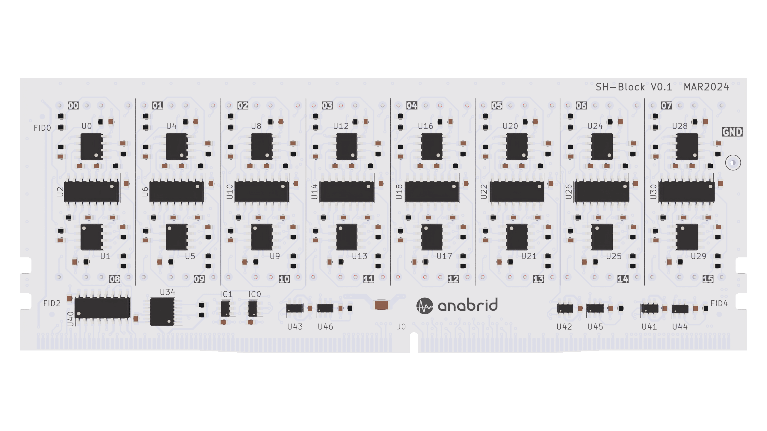 The SH block contains eight identical blocks, each with two sample and hold circuits (SHA_INJECT_A, SHA_INJECT_B). In the final design, a compensation path with an identical CMOS switch and storage capacitor was added to each sample and hold circuit. For this purpose, the storage capacitors were measured in pairs for identical capacities before assembly.